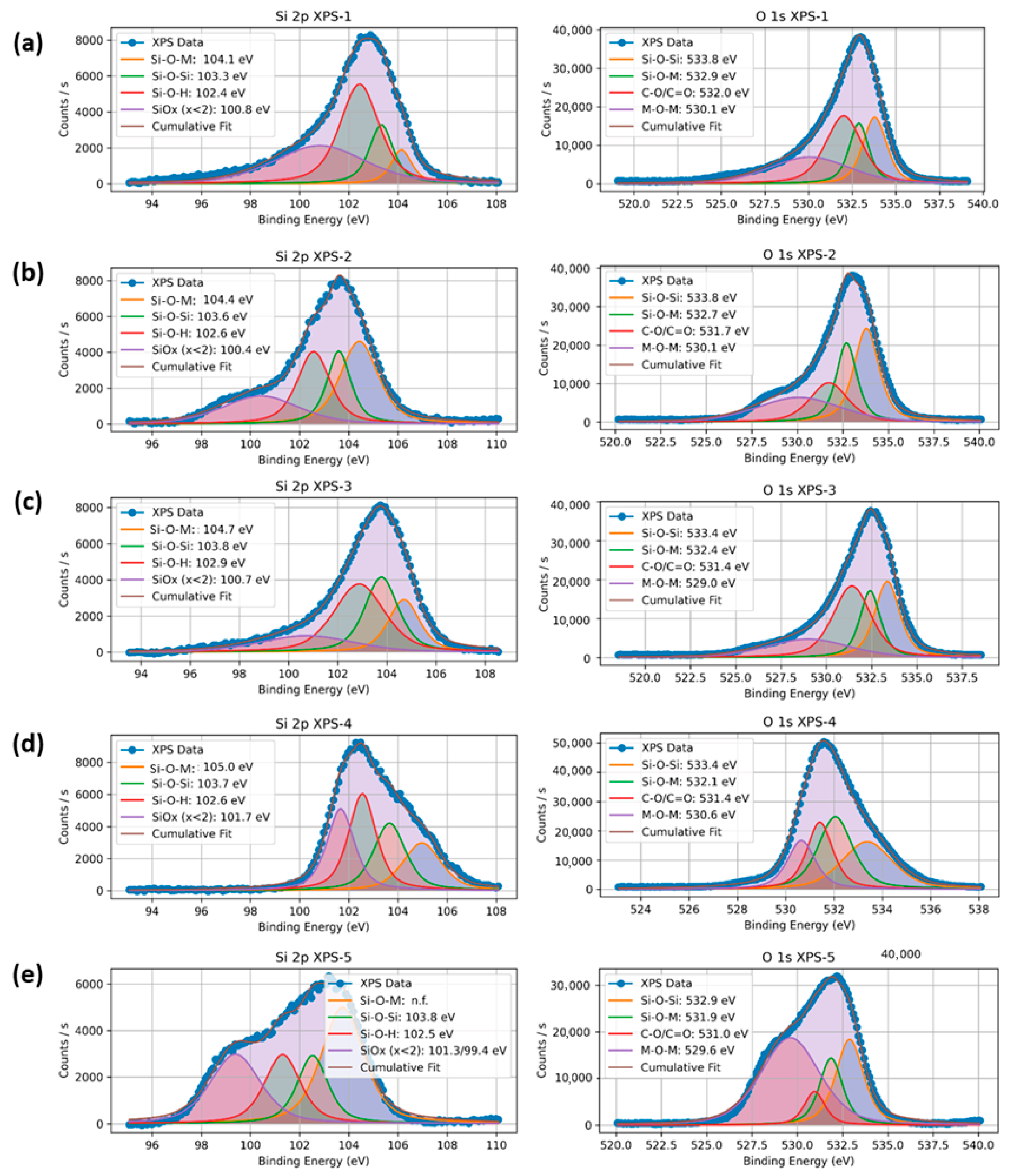 | Si–O–M | B.E. (eV) | 532.9 | 532.7 | 532.4 | 532.1 | 531.9 |