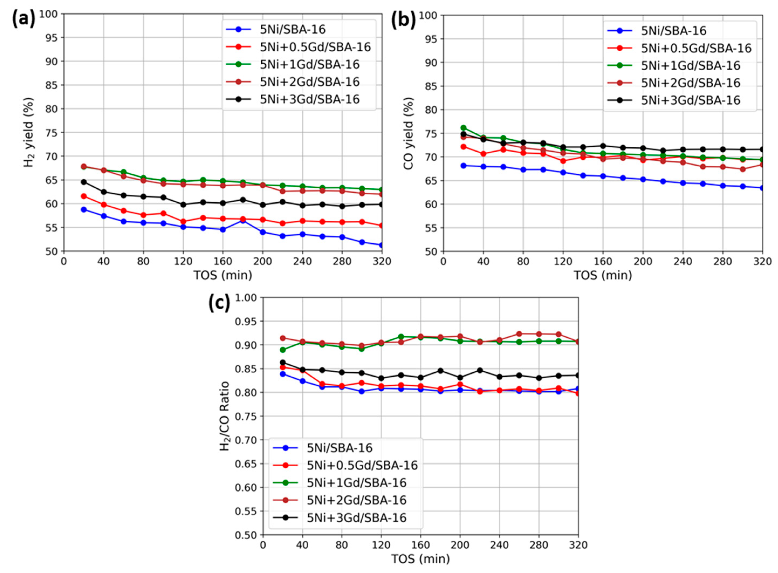 | 5Ni+2Gd/SBA-16 | 1 | 377.7 | 7.7 | 343.6 | 6.8 |