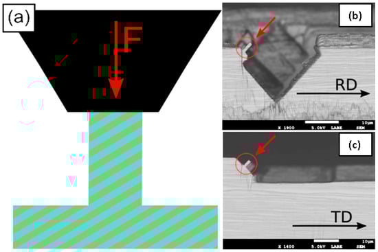 The crystallographic anisotropy in Cu/Nb nanolaminates leads to different interfaces along the RD and TD [,]. Typically, in situ rectangular micropillar compression experiments provide a well-defined stress state, making them suitable for studying anisotropy effects []. Additionally, apart from mechanical anisotropy, in situ micropillar compression could also provide more direct insights into mechanical behavior earlier and/or later, surpassing the elastic limit until rupture []. Furthermore, the response of the material during micropillar compression tests can be quantitatively mapped to understand the stress and strain distribution at small length scales [].
