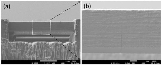 In order to fabricate Cu/Nb ARB microbeam samples, FEI Nova Nanolab dual-beam FIB at Nanyang Technological University’s (NTU) Microelectronics Reliability & Characterization Laboratory, Singapore was employed to manufacture clamped microbeams. FIB was used to prepare microbeams from pre-polished nanolaminates with ~63 nm layer thickness (see Figure 2). Initially, Cu/Nb ARB was milled at 30 kV with a high beam current to produce a clamped microbeam configuration. Subsequently, a low milling current was used for the finer cutting and polishing to the final dimensions. The center notches were milled at 10 pA current as a single line cut across the width of the beam. The notch depths were kept between 1/5 and 1/3 of the beam heights, whereas the notch widths ranged between 100 nm and 360 nm. Figure 2 shows representative images of the fabricated clamped microbeam. The microbeam dimensions were selected to satisfy both small-scale yielding and plane strain []. The small gradient height (height/thickness) typically permits stable crack expansion, whereas the large gradient height may prevent edge cracking for the above clamped microbeam configuration.