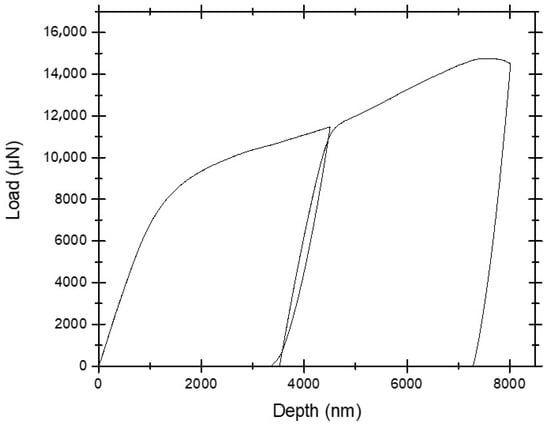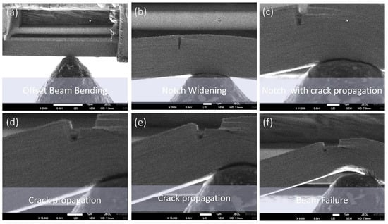 Load–displacement curve of ARB 63 nm Cu/Nb microbeam bending test with no offset loading (NOL) along TD: (1) the notch widens up until the instigation of crack, (2) additional notch widening with slight crack growth, (3) crack growth with notch widening, and (4) crack growth and formation of shear instabilities were suppressed due to the failure at one of the beam’s edges. No significant interfacial rotation was evident. Similar observations have been previously reported [,,].