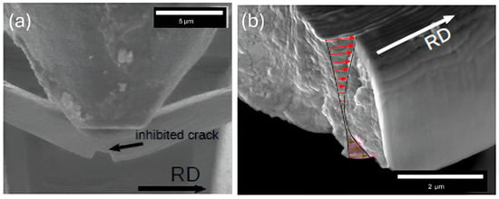 Cu/Nb-OL (Cu/Nb microbeam with offset loading) goes through similar regimes of notch widening and crack initiation, followed by its propagation and subsequent final failure (see Figure 5 and Figure 7). Nevertheless, the degree of the notch widening was rather low, around ~400%, compared to Cu/Nb-ARB-NOL (around ~900%). It is acknowledged that the motion of dislocations and thereby dislocation-mediated plasticity have a significant part in the deformation behavior of these Cu/Nb nanolaminates. Typically, dislocation transmission could occur across or along the interface of Cu/Nb nanolaminates, which could lead to the formation of shear band or interfacial shear, respectively, while in the case where dislocations do not transmit across or along the interface, interface tilting or rotation could occur []. In the present case, due to incorporation of the local bending moment at the notch tip, the interfacial shear was relatively more constrained along the TD (compared to Cu/Nb NOL), thus promoting interfacial shear along the RD (see Figure 8) and hence local interfacial rotation near the notch tip was evident (see Figure 9).