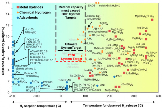 The hydrogen gravimetric capacity as a function of the hydrogen release temperature for numerous unique hydrogen storage materials [39].