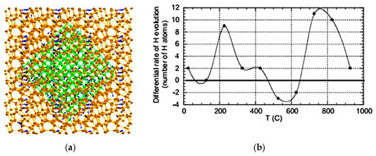Although extensive experimental studies have explored hydrogen generation from silicon nanomaterials and its underlying mechanisms, computational modeling remains relatively limited [61,62,63,64]. In this context, molecular dynamics simulations have been employed to investigate the temperature-dependent evolution of hydrogen from nanocrystalline silicon [65]. The model used in these simulations consisted of nanocrystallites heterogeneously dispersed within an amorphous silicon matrix (Figure 2a), with results indicating an excess hydrogen density localized at the nanocrystallite surfaces. A two-step hydrogen evolution process was observed, with a low-temperature peak between 250 and 400 °C attributed to hydrogen release from the nanocrystallite surfaces, followed by a second, higher-temperature peak between 700 and 800 °C (Figure 2b). This two-peak behavior is consistent with experimental hydrogen evolution measurements in hydrogen-diluted amorphous silicon (a-Si:H) grown near the crystalline phase boundary. The findings suggest that hydrogen is released into mobile molecular and bond-centered-like configurations, providing valuable insights into the thermal behavior of hydrogen in silicon-based materials.