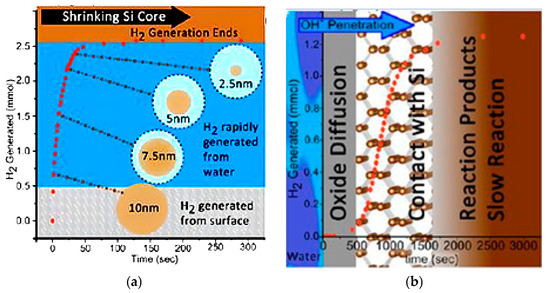 (a) Conceptual illustration of a shrinking core model that describes H2 generation from 10 nm Si NP. Brown spheres represent NPs, and the dotted circle indicates shrinkage from the original sphere size. The gray and blue areas represent hydrogen contributed by the silicon and by water, respectively. (b) A bulk diffusion model for reaction of larger particles (100 nm) for which OH− diffuses through an oxide layer during the induction period and reaction rates remain limited by diffusion through reaction products [72].