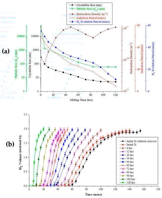 (a) Change in crystallite size and dislocation density with milling time; (b) H2 production over time during the reaction of initial 6, 12, 24, 36, 48, 60, 72, 84, 96, 108 and 120 h dry ball-milled Si samples mixed with sucrose (50% by weight) with 1 M NaOH alkaline water is shown. The same is shown for initial Si without sucrose for comparison [73].