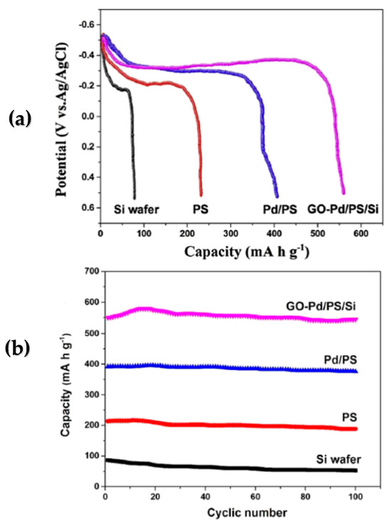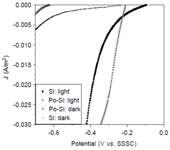 PS has been investigated as a promising material for enhancing hydrogen production in PEC systems, leveraging its increased surface area and reactivity compared to bulk silicon [98]. Electrochemical characterization of Si and PS photocathodes under both dark and illuminated conditions reveals a significant enhancement in cathodic current for PS, indicating a superior hydrogen evolution performance. In contrast, negligible photocurrent generation at the Si photocathode suggests that unmodified silicon is not an efficient material for PEC water splitting (see Figure 7). Furthermore, PS-based photocathodes exhibit stable performance in acidic environments over multiple measurements, demonstrating their durability under operational conditions.