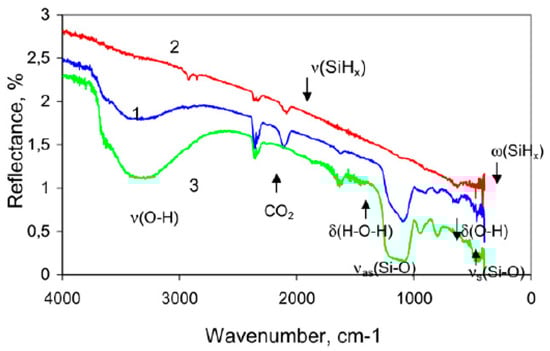 The electrochemical etching process results in the formation of PS with a surface densely populated with hydrogen-terminated species, leading to significant hydrogen coverage [87]. Fourier transform infrared (FTIR) spectroscopy has been extensively used to analyze the chemical composition of PS, revealing the presence of both SiHx species and oxidized surface groups that form during thermal annealing [88,89]. These detailed spectral assignments provide crucial insights into the interaction of PS with hydrogen and oxygen, contributing to a deeper understanding of its surface chemistry.