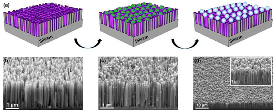Ultralong porous SiNW arrays, approximately 400 μm in length [108], have been successfully synthesized using the metal-assisted anodic etching (MAAE) method [109,110,111,112]. The fabrication process allows precise control over the diameter and density of the SiNW arrays through nanosphere lithography, enabling the formation of structures optimized for specific applications [109,110,113,114]. The resulting SiNWs measure 425 ± 25 µm in length and 200–300 nm in diameter, exhibiting a porous architecture with irregular edges and surfaces. These nanowires possess a high specific surface area of 413 m2/g and an average pore diameter of 4.6 nm, which significantly enhances their reactivity.
