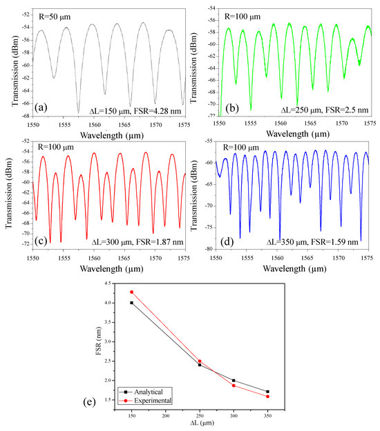 Transmission versus ∆L, (a) 150 µm, (b) 250 µm, (c) 300 µm, (d) 350 µm, (e) Comparison between analytical and experimental results showing the variation in FSR as a function of ∆L. Note: Spectra are plotted in absolute power (dBm) and were acquired in separate alignments; therefore, absolute levels across panels are not directly comparable.