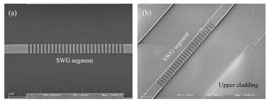 SEM images of the SWG segment integrated into the sensing arm: (a) top-view image highlighting the periodic SWG pattern and waveguide geometry, and (b) angled-view image providing three-dimensional insight into the structural profile and sidewall quality of the fabricated segment.
