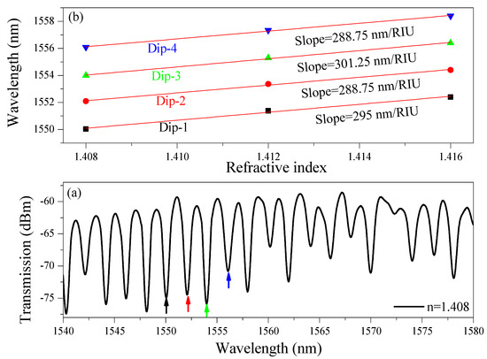 Figure 7a displays the transmission spectrum in the 1540–1580 nm range of the a-LT-MZI when the ambient refractive index is 1.408. Four distinct interference dips (Dip-1 = 1550.04 nm, Dip-2 = 1552.09 nm, Dip-3 = 1553.99 nm, and Dip-4 = 1556.09 nm) are selected in the spectrum, each corresponding to the device’s constructive and destructive interference conditions. The sharpness and regularity of these dips confirm the high-quality interference established in the a-LT-MZI, providing reliable interrogation points for sensing applications. The FWHM of the dips is approximately 0.7 nm. Figure 7b presents the wavelength shifts in the same dips as the refractive index varies from 1.408 to 1.416. A clear and linear redshift is observed for all four dips, indicating that the spectral response of the device is directly and predictably correlated with changes in the ambient refractive index. Experimentally, the sensitivities (nm/RIU) and FOM values were measured as 295 and 421.4 for Dip-1, 288.75 and 412.5 for Dip-2, 301.25 and 430.35 for Dip-3, and 288.75 and 412.5 for Dip-4, respectively. These values fall within a narrow range, showing that the four dips exhibit comparable sensitivity rather than large variations between interference orders. This uniformity is advantageous because it ensures that any of the interference dips may be chosen as the sensing reference without significant compromise in sensitivity. Moreover, the presence of multiple interference dips with similar sensitivities allows for simultaneous interrogation of more than one dip. This approach can improve robustness by reducing the influence of noise, environmental drift, or fabrication tolerances, while also enabling multi-parameter sensing strategies if required.