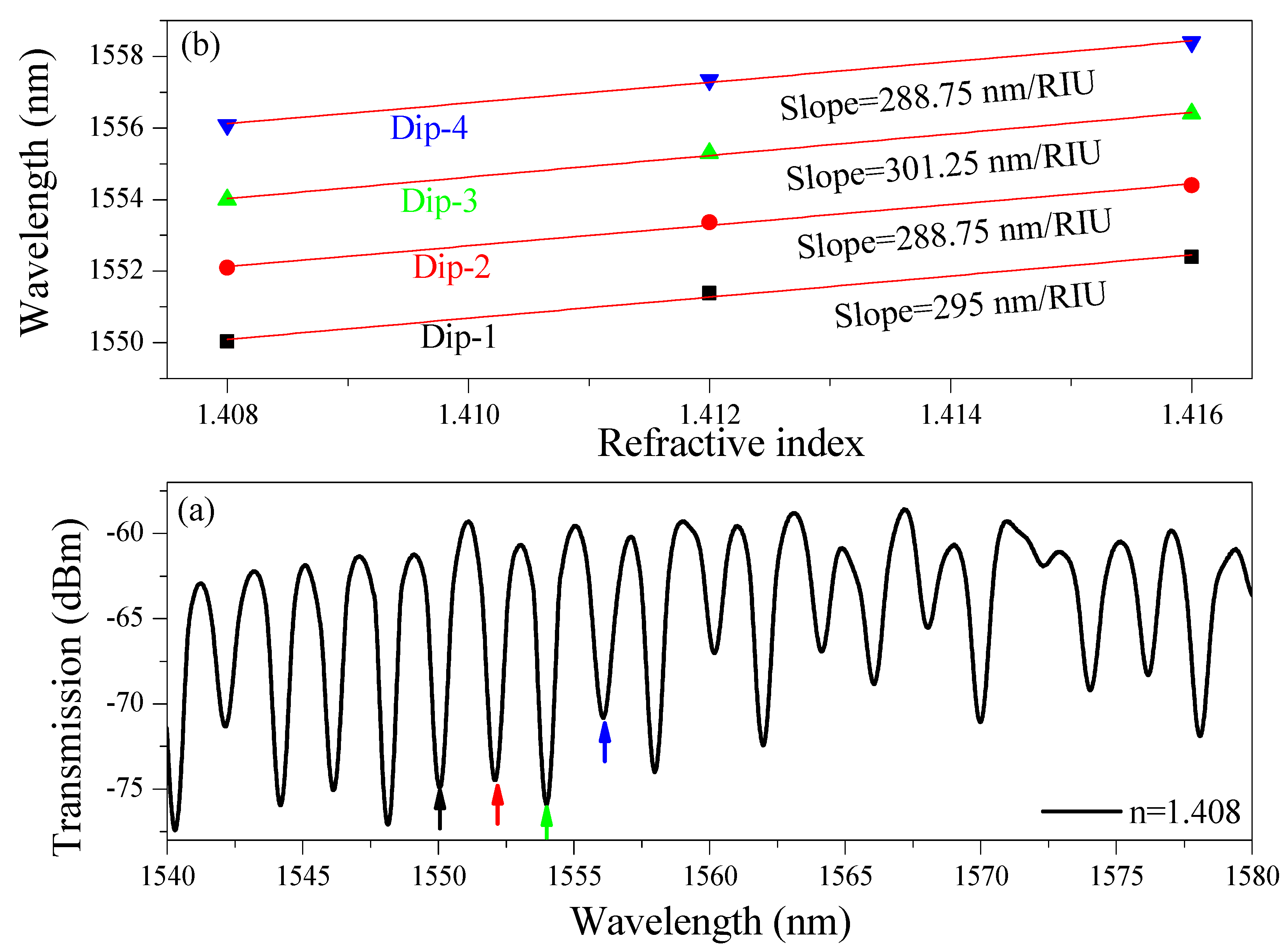 - Zhang, L.; He, H.; Zhang, S.; Xiong, Y.; Pan, R.; Yang, W. Highly Sensitive Optical Fiber MZI Sensor for Specific Detection of Trace Pb2+ Ion Concentration. Photonics 2024, 11, 631. [Google Scholar] [CrossRef]