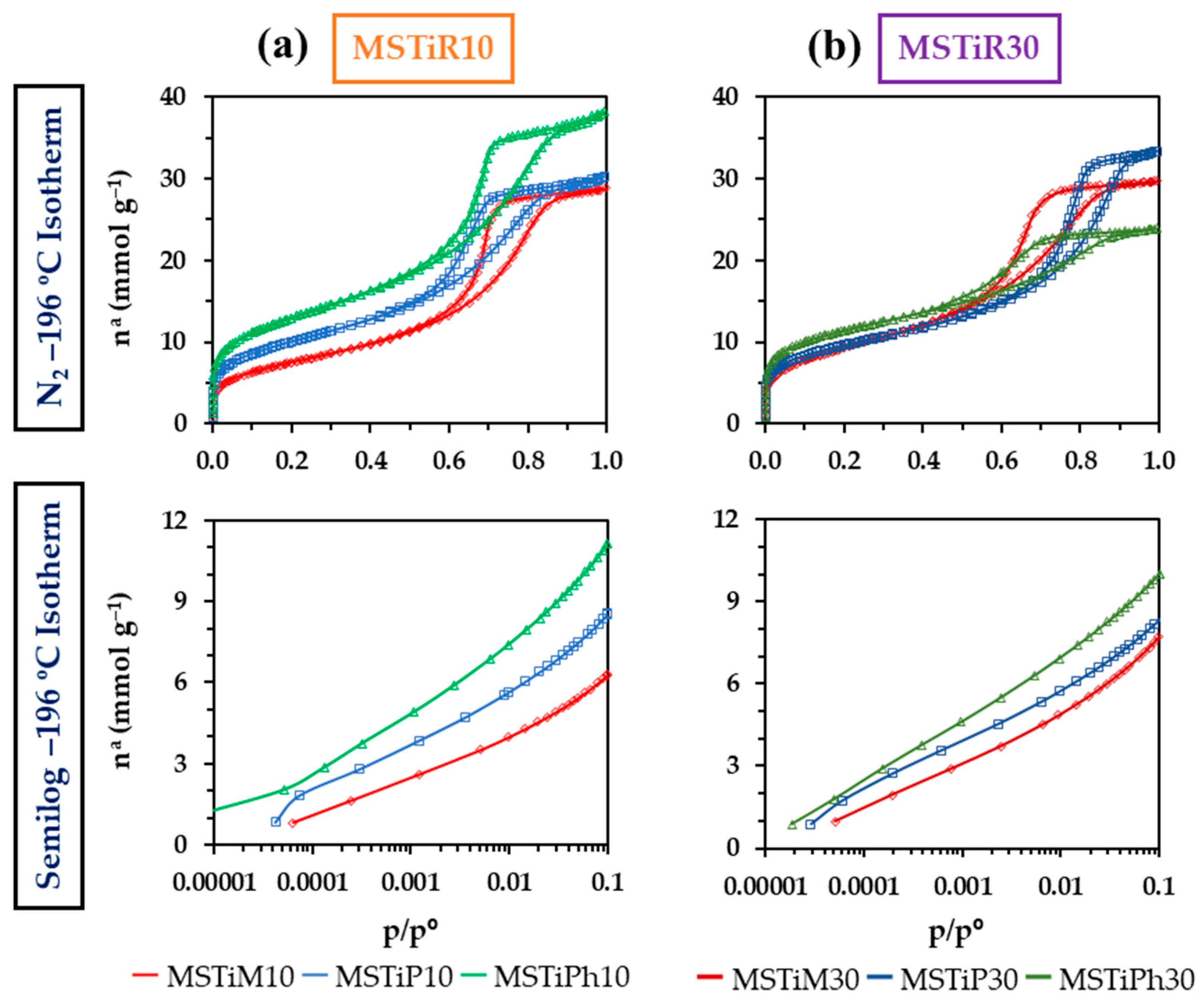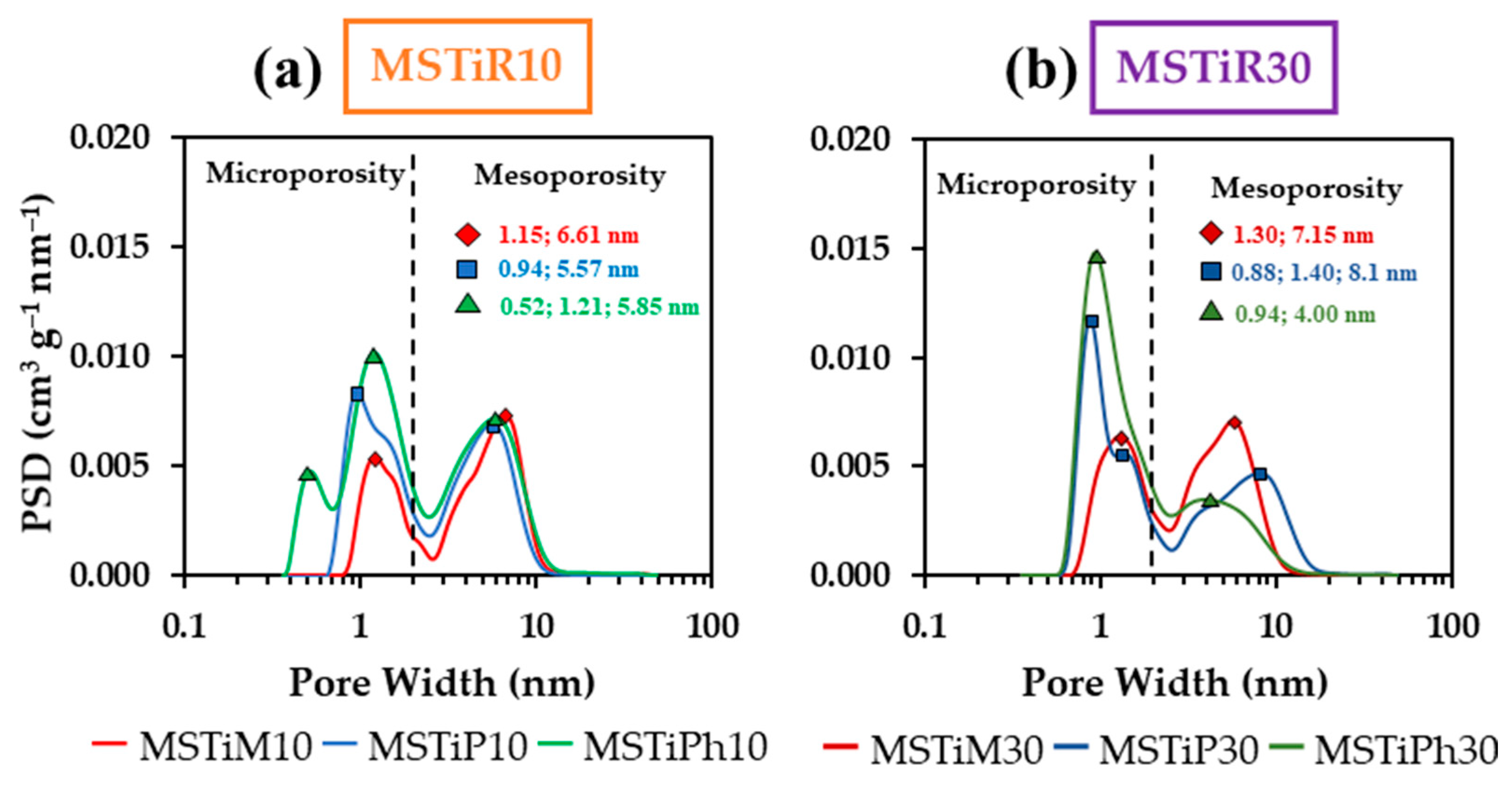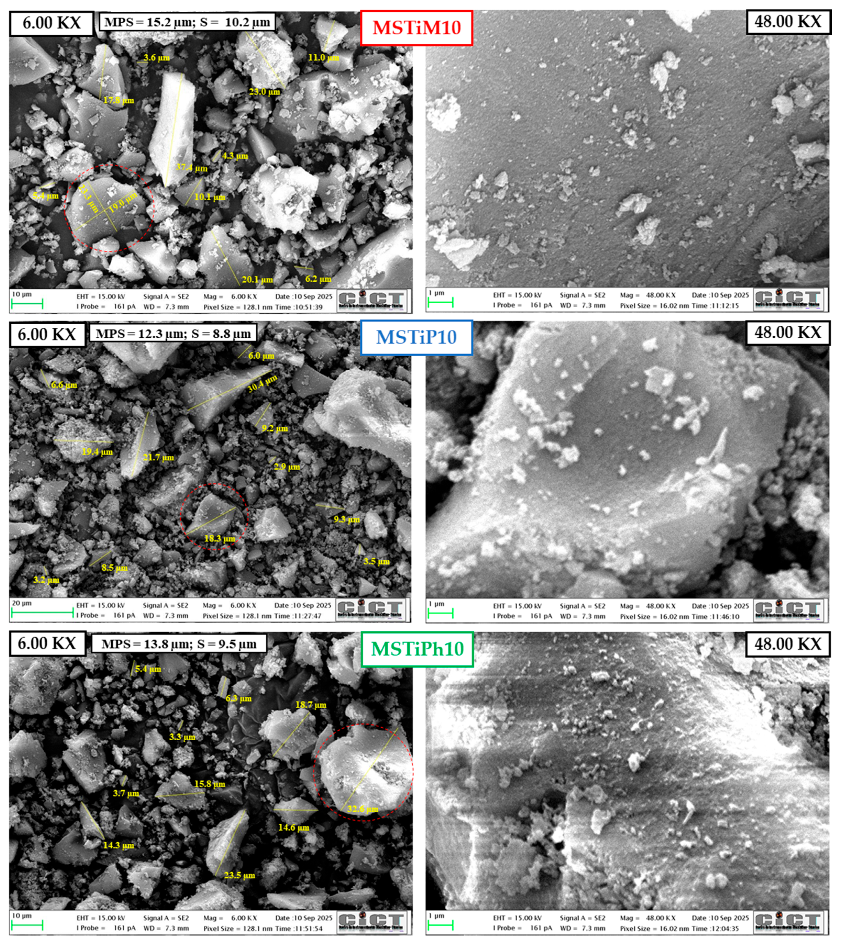 3.1. Characterization Analysis of the MSTiR% Materials