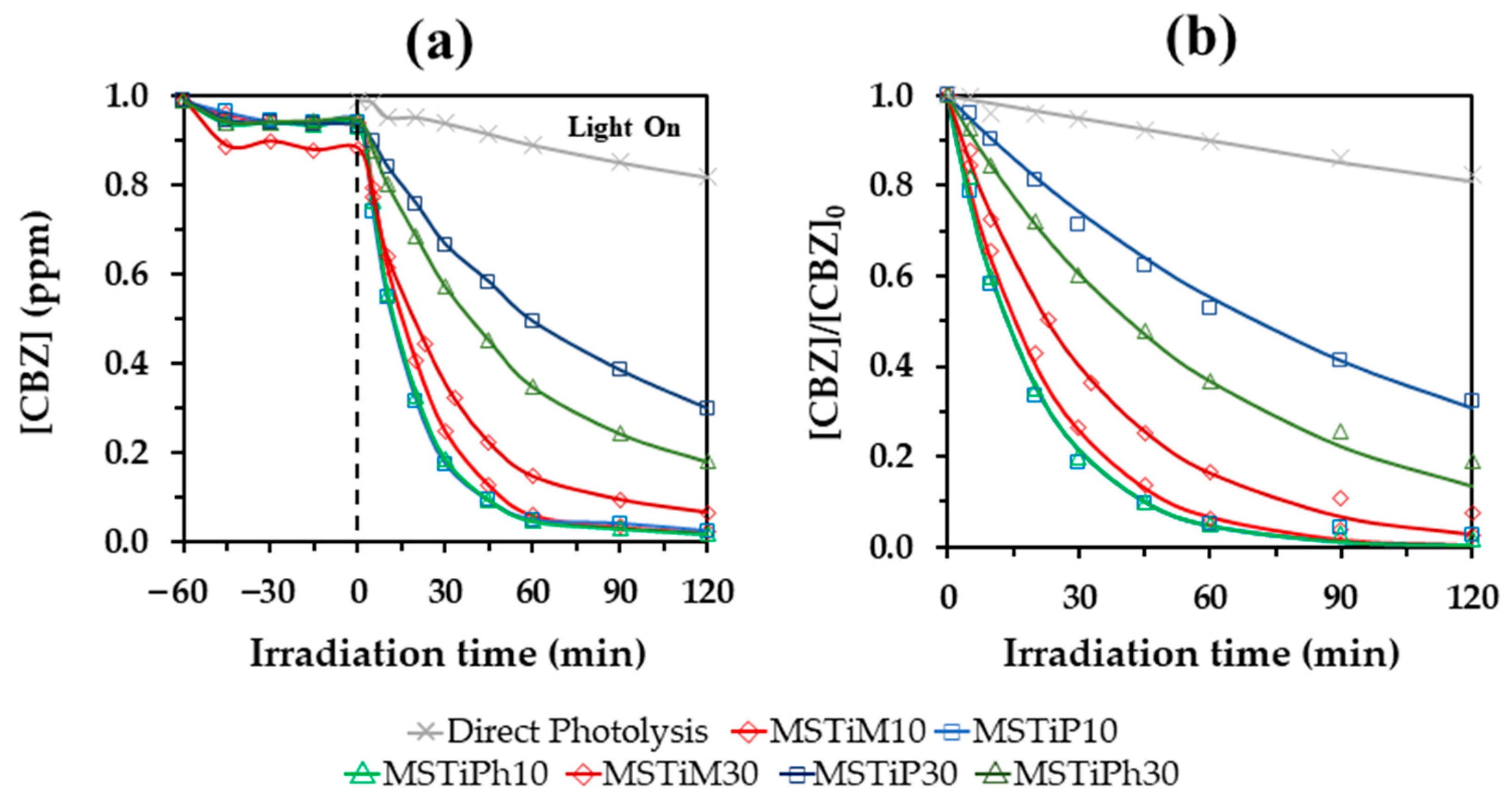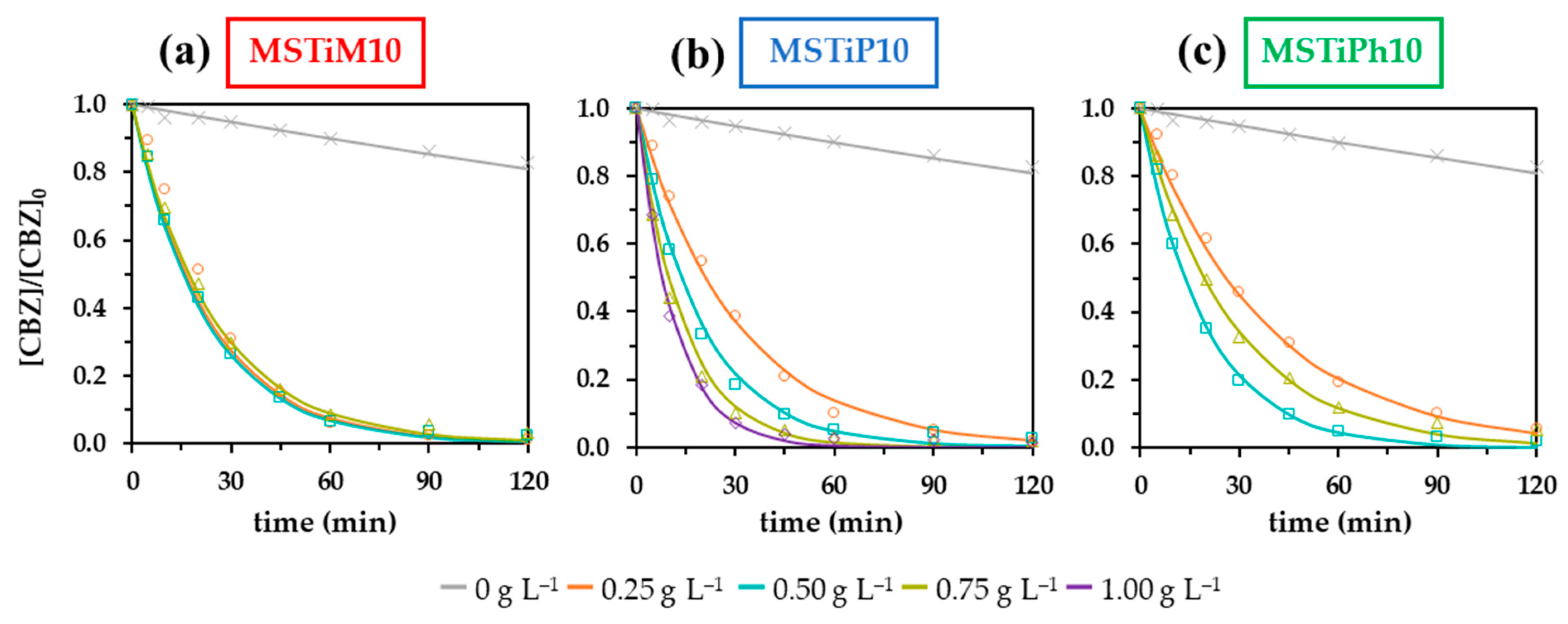 3.2. Photocatalytic Degradation of CBZ in the Presence of MSTiR%