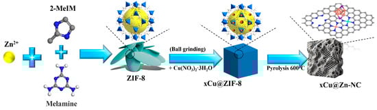 The xCu@ZIF-8 precursor was subjected to pyrolysis in a tube furnace at 600 °C for 2 h in an argon environment, with a ramping rate of 5 °C/min. After the sample had naturally cooled to room temperature, it was collected. The obtained sample was designated as xCu@Zn-NC. For comparison, the Zn-NC product was also synthesized from the pyrolysis of ZIF-8 utilizing the same methodology. The synthesis protocol is illustrated in Figure 1.