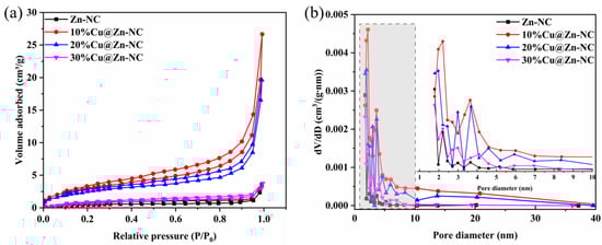 The specific surface area and pore structure of Zn-NC and xCu@Zn-NC samples were tested by the N2 adsorption–desorption analysis. Figure 3 demonstrated that all samples displayed type IV isotherms, signifying that the porous structures were primarily mesoporous [29,41]. This observation could be further corroborated by the BJH pore size distribution curves, which showed the pore sizes of Zn-NC, 10%Cu@Zn-NC, 20%Cu@Zn-NC, and 30%Cu@Zn-NC samples were centered at around 2.23, 2.11, 2.12, and 2.32 nm, respectively. The BET surface areas of the samples were determined using N2 adsorption–desorption isotherms, and Table S1 provides a summary of the findings. Pure Zn-NC, 10%Cu@Zn-NC, 20%Cu@Zn-NC, and 30%Cu@Zn-NC were found to have BET specific surface areas of 1.98, 11.50, 9.66, and 1.50 m2/g, respectively. Obviously, the presence of an adequate amount of Cu particles could increase the specific surface area of xCu@Zn-NC. Nevertheless, the specific surface area decreased with the Cu content increasing. This could be attributed to the formation of larger particles during the carbonization process, as evidenced by the SEM results (Figure 2f,i).