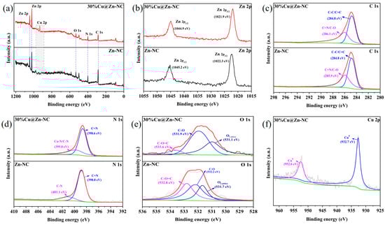 XPS patterns of Zn-NC and 30%Cu@Zn-NC. (a) Survey spectra; (b) Zn 2p spectra; (c) C 1s spectra; (d) N 1s spectra; (e) O 1s spectra; (f) Cu 2p spectra.