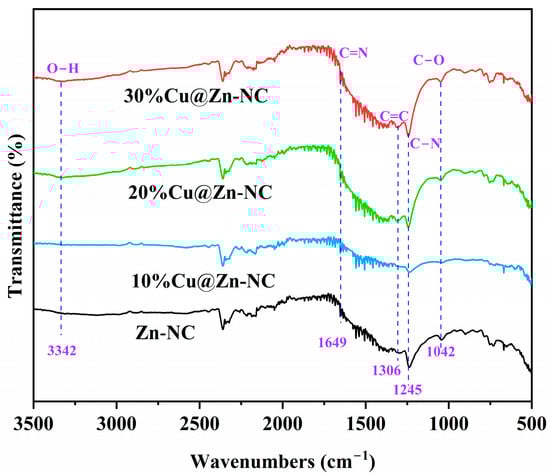 FT-IR spectra was conducted to examine the functional groups in the xCu@Zn-NC samples (Figure 6). As depicted, the observed faint wideband at 3342 cm−1 corresponded to the stretching vibration of O-H, which resulted from the adsorption of ambient water molecules [38]. The bands around 1042, 1245 and 1306 cm−1 indexed to the stretching vibration of C-O, C-N and C=C bonds [49,50,51], respectively. The weak band at 1649 cm−1 was ascribed to the C=N stretching vibration [52]. These findings fundamentally corresponded with the results acquired from XPS analysis.