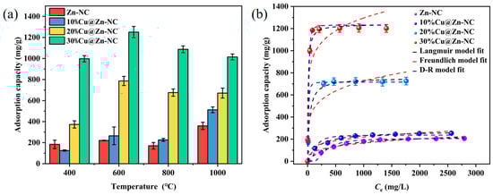 The influence of Cu proportion and pyrolysis temperature on the I2 adsorption performance of xCu@Zn-NC was investigated, and the result was shown in Figure 7a. As presented, the adsorption amount of the tested samples augmented with the increasing content of Cu at different pyrolysis temperatures. When the carbonization temperature increased from 400 to 1000 °C, the I2 adsorption performance of xCu@Zn-NC (x = 20% and 30%) initially increased and was followed by a subsequent decrease. When the Cu content was 30% and the pyrolysis temperature was 600 °C, the xCu@Zn-NC sample had the optimal adsorption capacity (1204.9 mg/g) for I2. Based on this, 600 °C was chosen as the pyrolysis temperature in subsequent research. Here, it should be noted that continuing to increase the Cu content in xCu@ZIF-8 would lead to a sharp decrease in the sample amount after carbonization. Therefore, considering the available sample amount and the adsorption performance, the Cu content ranged from 0 to 30%.