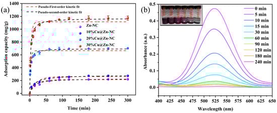The adsorption kinetic investigation was conducted to ascertain the adsorption rate and equilibrium time of the xCu@Zn-NC samples for I2. In Figure 8a, the adsorption amount of I2 by xCu@Zn-NC composites increased rapidly within the first 25 min. This might be characterized as an instantaneous adsorption stage or an external surface adsorption mechanism, attributable to the presence of adequate active adsorption sites on the xCu@Zn-NC surface [56,57]. However, as the contact time extended, the adsorption rate began to decrease because of the occupation of adsorption sites and the decrease of I2 concentration, making it difficult for the adsorbent to adsorb I2. Subsequently, a prolonged adsorption phase occurred, ultimately achieving equilibrium in roughly 60, 60, 30, and 30 min, with saturation uptake amounts of 219.5, 273.2, 703.1, and 1173.2 mg/g for Zn-NC, 10%Cu@Zn-NC, 20%Cu@Zn-NC, and 30%Cu@Zn-NC, respectively. To enhance the comprehension of the adsorption rate, the color change in the solution was documented at various time intervals. It could be clearly observed from Figure 8b that the solution color changed from dark purple to clear within 45 min. The UV–visible absorption spectra further validated that nearly all I2 in solution could be eliminated by the 30%Cu@Zn-NC composite. In pursuit of a more comprehensive investigation, the adsorption capability and adsorption kinetic of 30%Cu@Zn-NC toward I2 were evaluated in relation to other adsorbents documented in prior literature. The results (Table 1) showed that the uptake amount of 30%Cu@Zn-NC for I2 was significantly greater than or comparable, while it showed relatively fast adsorption kinetic.