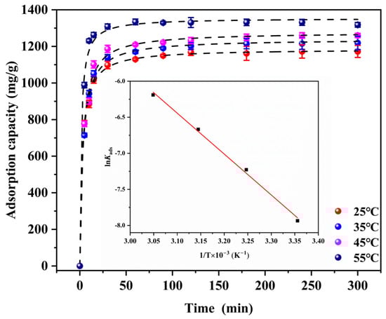 where Eα represented the activation energy (kJ/mol); Kads was the adsorption rate constant; A was the Arrhenius constant. From the pseudo-second-order kinetic studies (Table S6), Ks was the adsorption rate constant, i.e., Kads. According to previous research, the activation energy of physical adsorption was lower than 4.0 kJ/mol, while the activation energy of chemical adsorption was 8.5~83.5 kJ/mol [61]. In this work, Eα was determined as 47.2 kJ/mol (Table S7), indicating that adsorption taken place through the chemical adsorption. Additionally, the positive value of Eα implied that increase in temperature favored the adsorption. Therefore, the endothermic characteristic of the adsorption process was indicated by the positive value.
