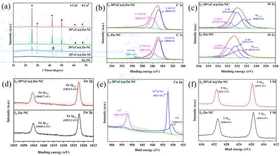 XPS research was performed to further examine the surface composition and oxidation state of elements in Zn-NC and 30%Cu@Zn-NC composites. Figure 5a and Table S2 confirmed the presence of Cu element in the 30%Cu@Zn-NC sample, while Zn, N, O, and C elements were distinctly observable in both samples. The Zn 2p XPS spectra (Figure 5b) for both samples had two peaks, which were attributed to Zn 2p3/2 and Zn 2p1/2, respectively. The Zn in Zn-NC and 30%Cu@Zn-NC was mostly present as Zn2+, as indicated by the binding energy difference of almost 23.0 eV between the two peaks [46]. Meanwhile, the analysis of the XRD pattern (Figure 4b) revealed the absence of diffraction peaks corresponding to Zn or ZnO, potentially indicating that the Zn species presented in an amorphous state in matrix [29]. The C 1s XPS spectra (Figure 5c) of the 30%Cu@Zn-NC sample could be deconvoluted into two peaks, representing the sp2-hybridized graphitic carbon C-C/C=C (284.8 eV) and C=N/C-O (286.1 eV) [3,47,48], respectively. Compared with 30%Cu@Zn-NC, the binding energy of C=N/C-O (285.9 eV) in Zn-NC had a slight shift (0.2 eV), which might be resulting from the incorporation of Cu. The N 1s XPS spectra (Figure 5d) could be deconvoluted into two peaks of C=N and C-N (C-N/Cu-N for the 30%Cu@Zn-NC sample), respectively. The presence of Cu-N peaks indicated that N could interact with atomically dispersed metal atoms to generate M-Nx, while the shift of the binding energy of C-N/Cu-N peaks revealed N could influence the electronic characteristics of the carbon structure [3]. The O 1s XPS spectra (Figure 5e) was asymmetric and could be deconvoluted into three peaks, assigning to the C-O=C, C-O, and lattice oxygen, respectively. The Cu 2p XPS spectra (Figure 5f) in 30%Cu@Zn-NC exhibited two characteristic peaks of Cu 2p3/2 and Cu 2p1/2 at binding energies of 952.6 and 932.7 eV, respectively. No satellite peaks were found, suggesting that Cu in 30%Cu@Zn-NC existed as Cu0 or Cu+ [24,29,38]. Combining the XRD analysis, Cu in 30%Cu@ Zn-NC existed in the Cu0 form.
