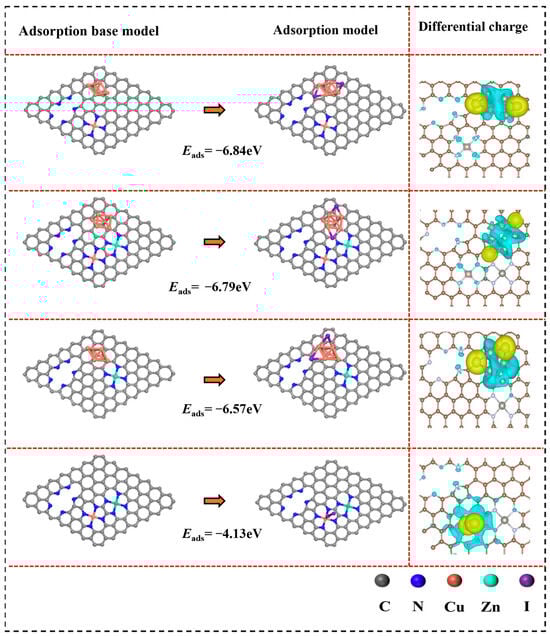 Configuration and charge density difference of I2 adsorption on different models of Cu@Zn-NC.