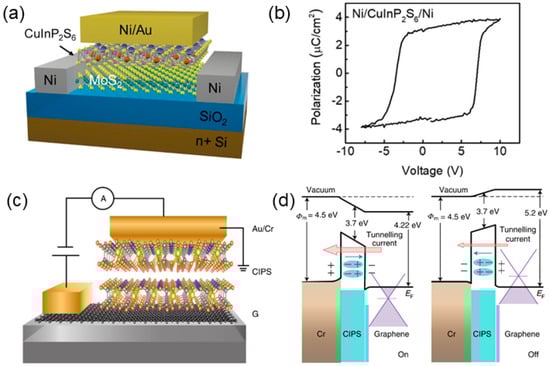 2D FE field-effect transistors (FETs) are the representative devices that utilize FE switching to control the conducting channel and achieve the on/off states. The integration of 2D FE materials with 2D semiconductors results in vdW heterostructures, which could effectively avoid interface problems and improve the performance of FET. Such strategy was implemented by constructing a CIPS monolayer on the top of MoS2, as shown in Figure 2a [36]. Without dangling bonds, the as-constructed heterostructure offers a semiconductor/insulator interface. The polarization versus voltage curves exhibit a well-defined hysteresis loop, indicating the ferroelectricity of the heterostructure, as shown in Figure 2b [36]. Importantly, the measured on/off ratio can reach 104 through tuning the capacitance matching, which can be modulated by the back-gate bias of the MoS2 transistor. As an FE switchable diode, CIPS/Si heterostructure exhibits good memory behavior, with an on/off ratio of about 100 [28]. Moreover, the FE tunnel junction (FTJ) of Cr/CIPS/graphene layered heterostructures also show high tunneling electroresistance (TER, >107), where CIPS can modulate the FE barrier [37]. Figure 2c shows the schematic of the FTJ. Such giant TER could be explained by the influence of FE polarization on the Fermi level of graphene. For the on-state, n-type graphene leads to the up-shifted Fermi level, while during the off-state, the switched polarization of CIPS induces the down-shifted Fermi level, as shown in Figure 2d.