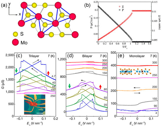 (a) Trimerization of Mo atoms in the 1T crystal structure with a unit cell [41]. (b) Polarization (P) and dielectric susceptibility (χ) as a function of temperature derived from Landau theory [41]. (c–e) Conductance G of undoped trilayer, bilayer, and monolayer device as E⊥ is swept up and down (black arrows) [21]; The polarization is represented by a green or red arrow in (c); The location of a centre of symmetry is represented by a red dot in (e). Reprinted with permission from [41], 2014, American Chemical Society; and [21], 2018, Springer Nature.