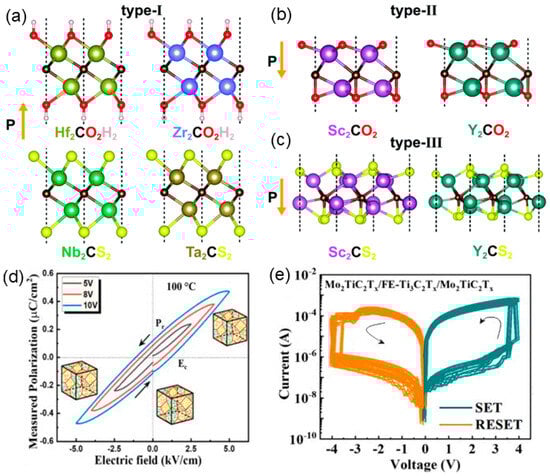 (a) The geometries of stable type−I (a), II (b), and III (c) FE MXenes [53]. (d) FE hysteresis loops of the Ti3C2Tx MXene film at 100 °C [54]. (e) Nonvolatile bipolar switching in single cell for logarithmic I–V measurements [54]. Reprinted with permission from [53], 2020, Royal Society of Chemistry; and [54], 2023, AIP Publishing.