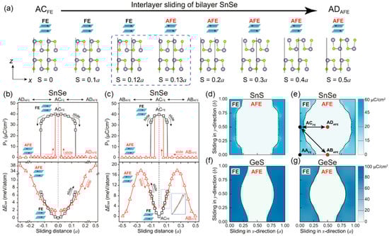 (a) Description of sliding processes. FE polarization and total energy difference as functions of the sliding distance for bilayer SnSe shifted (b) from AC to AD and (c) from AC to AB stacking sequences. (d–g) Contour plots of spontaneous polarization as a function of mechanical sliding distance for SnS, SnSe, GeS, and GeSe, respectively [68]. Reprinted with permission from [68], 2022, Springer Nature.