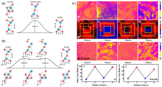 The energy barrier of polarization reversal in α-In2Se3 through (a) one-step and (b) three-step concerted mechanisms [72]; In and Se atoms are in blue and red, respectively. (c) In-plane (initial a1–d1 and switched a2–d2 states) and out-of-plane (switched e–h states) PFM phase images of 2H-stacked α-In2Se3 with different layers [73]. Reprinted with permission from [72], 2017, Springer Nature; and [73], 2021, Royal Society of Chemistry.