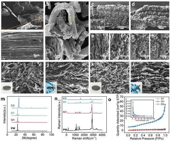 Morphology and structural characterizations of the PW/EG composites. The SEM image of (a) expandable graphite, (b) EG, (c) EG with the PW powder, (d) EG with the PW coating, the skeleton of composites with (e) 10 wt. % EG, (f) 8 wt. % EG, (g) 6 wt. % EG, (h) 5 wt. % EG, (i) transverse section and (j) longitudinal section of composites prepared by pressure-induced method, (k) transverse section and (l) longitudinal section of composites prepared by prefabricated skeleton method. (m) XRD and (n) Raman spectrum results for EG, PW, and the PW/EG composites, (o) Sorption and desorption curves and Pore size distribution of EG skeleton, SH5 and SY5.