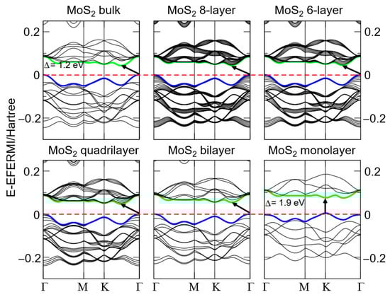 - Kuc, A.; Zibouche, N.; Heine, T. Influence of Quantum Confinement on the Electronic Structure of the Transition Metal Sulfide TS2. Phys. Rev. B 2011, 83, 245213. [Google Scholar] [CrossRef]