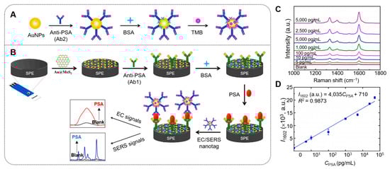 - Yaiwong, P.; Jakmunee, J.; Pimalai, D.; Ounnunkad, K.; Bamrungsap, S. An Electrochemical/SERS Dual-Mode Immunosensor Using TMB/Au Nanotag and Au@2D-MoS2 Modified Screen-Printed Electrode for Sensitive Detection of Prostate Cancer Biomarker. Colloid Surf. B Biointerfaces 2024, 243, 114124. [Google Scholar] [CrossRef]