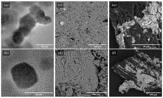 TEM bright field images of nanomagnetites (a,b) and SEM images of biochar samples: unwashed biochar (c) and biochar washed with HCl (d), and nanomagnetite–biochar composite (e,f). Images (c,d) were captured using backscattered electron imaging, while images (e,f) were obtained in secondary electron mode.