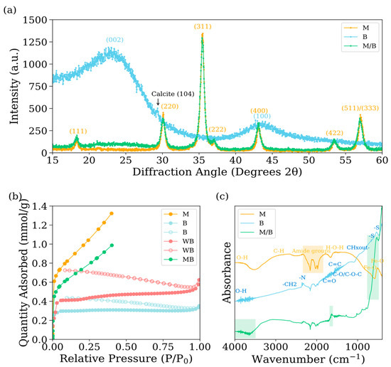 Further structural analysis through XRD confirmed the presence of magnetite cubic structures (18.328°, 30.054°, 35.41°, 35.074°, 43.184°, 53.402°, and 56.964°) and graphite (peaks at 23.044° and 43.688°) within the materials. A minor peak observed at 29.336° in B sample suggests the formation of calcite crystals, likely resulting from the commercial final stages of production, during which the biochar was cooled using clay and ash (Figure 2a). The Brunauer–Emmett–Teller (BET) adsorption isotherms revealed distinct characteristics among the materials under investigation (Figure 2b). Both nanomagnetite (M) and the nanomagnetite–biochar composite (MB) displayed Type II isotherms, which are associated with multilayer adsorption processes characteristic of mesopores ranging from 2 to 50 nm. Biochar (B) exhibited a Type I isotherm, indicative of the presence of micropores with diameters less than 2 nm, corroborating the macroporosity identified through SEM images. The BET-specific surface area (SSA) measurements were determined to be 79 m2/g for M, 28 m2/g for B and 59 m2/g for MB. These findings are consistent with, yet distinct from, the existing literature, which reports SSA values for this specific biochar ranging from 0.183 m2/g [19] to 270 m2/g [20]. Such variability in SSA is likely attributable to differences in experimental conditions, particularly particle size screening. It is well-established that finer particles typically exhibit larger SSA [21]. Despite this variability, the findings from both the literature and the present study suggest that biochar is characterized by limited microporosity and a predominance of macropores.