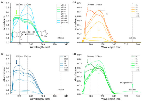 Further investigation into the UV–vis spectra of BTA across varying pH levels (Figure 3a) revealed a similar spectral behavior. At pH values up to 8.6 (corresponding to BTA’s pKa), a decrease in absorbance at 260 nm was observed alongside an increase at 274 nm, indicative of BTA deprotonation. Below the pKa, under acidic conditions, the spectral changes reversed, with an increase in absorbance at 260 nm and a decrease at 274 nm, reflecting BTA protonation.