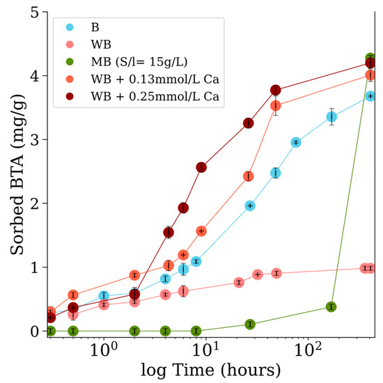 Kinetics BTA adsorption (mg BTA/g adsorbent) for various adsorbent materials: MB—biochar/magnetite (green); B—biochar (blue); WB—biochar washed with HCl (red) materials. Experimental conditions: initial BTA concentration of 100 μmol/L, pH 7, 2 g/L solid concentration. For WB, measurements were taken in presence of 0.13 mmol/L and 0.25 mmol/L Ca2⁺. Experiments with MB composite used 15 g/L solid concentrations.