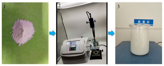 The suspension is prepared by first pouring the water reducer into the water and stirring for 10 min to obtain the aqueous solution, pouring NA into the aqueous solution, and dispersing it with an ultrasonic processor for 30 min, which obtains the suspension used in the test. The dispersion process is shown in Figure 2, which shows (1) nano-alumina, (2) ultrasonic dispersion, and (3) dispersed suspension. The concrete mixture is prepared by first pouring the cement, sand, and aggregate into the mixer and mixing evenly, and then the suspension is poured into the mixture and is stirred for 1–2 min, and the concrete mixture used in the test is obtained. The specimens are prepared as follows. The concrete samples are made into sizes of 100 × 100 × 100 mm3 and Φ100 × 50 mm3 for the compressive strength and Coulomb electric flux tests, and the cement mortar samples are made into sizes of Φ50 × 100 mm3 for the mercury intrusion porosimeter test. Finally, for the curing samples, all specimens were demolded after 12 h and then placed in a standard curing room (20 ± 2 °C) for 28 days.