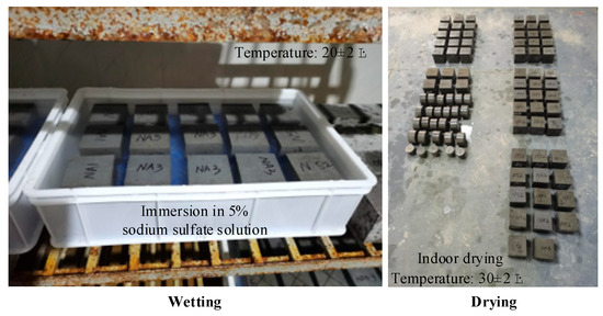 The W–D cycle test of a sample subjected to a sodium sulfate solution is shown in Figure 3. The specimen was first soaked in the sodium sulfate solution in the turnover box of a standard curing room and was then dried in a working room with a constant temperature. A W–D cycle lasted one week, with five days of wetting and two days of drying. The liquid used for immersion was a sodium sulfate solution with a concentration of 5% that was replaced once a month. To ensure that the sample was in complete contact with the sodium sulfate solution in the wetting stage, a hollow grid liner was placed at the bottom of the turnover box. The spacing between the samples was 2 cm, and the sodium sulfate solution was 2 cm higher than the top surface of the sample. The soaked samples were taken out of the turnover box in the drying stage and placed in the workshop to dry. The temperature was controlled at 30 ± 2 °C.