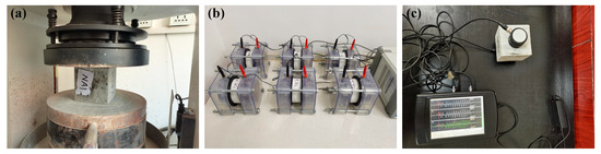 Figure 4 shows the tests conducted to measure the compressive strength, Coulomb electric flux, mass loss, and velocity of ultrasonic waves of the concrete samples during the W–D cycle according to the Chinese standards [27,28]. The loading rate was 0.5 MPa/s, the constant DC voltage was 60 ± 0.1 V, the accuracy of mass was 0.5 g, and the frequency of the waves was 50 KHz.
