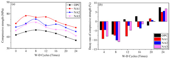 Previous studies have shown that the compressive strength of NA-modified concrete is higher than that of ordinary concrete and decreases with an increase in the amount of NA. The compressive strengths of the samples were NA1, NA2, NA3, and OPC in descending order [29,30]. A sulfate attack is a slow and continuous process, during which structural degradation becomes progressively more pronounced as salt intrusion increases. The changes in the compressive strength of the specimens with the number of W–D cycles are shown in Figure 6a. The compressive strength of all specimens increased first and then decreased, where the eighth cycle was the cut-off point. Their compressive strength decreased due to the crystallization pressure generated by the crystallization of the crystals formed by the reaction of sodium sulfate and the dry shrinkage-induced deformation caused by the W–D cycle. The compressive strength of the specimen did not decrease at the beginning but only gradually after eight W–D cycles. This was observed because the crystallization pressure and dry shrinkage-induced deformation developed slowly, and their destructive effects were subjected to the W–D cycles, such that their compressive strength had not yet reached its maximum value. It gradually increased and significantly exceeded the erosive and destructive effects of the sodium sulfate solution in the first few cycles. After eight cycles, the crystallization pressure generated by the sodium sulfate crystals and the dry shrinkage-induced deformation caused by W–D cycles became dominant and had noticeable adverse effects on the mechanical properties of concrete. Its compressive strength began to decrease with an increasing number of W–D cycles.