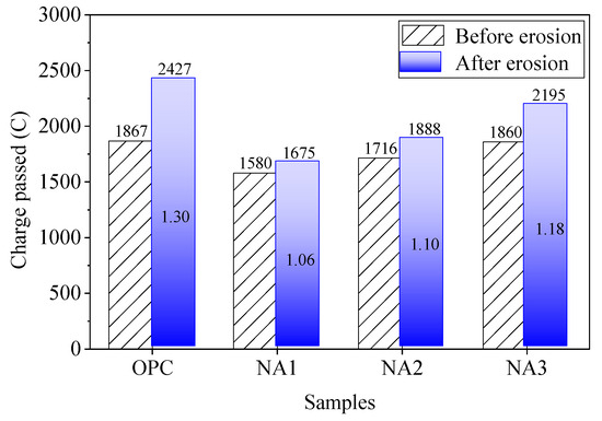 The charge-passed values of concrete were tested before and after the W–D cycles, and the difference was used to evaluate the permeability of the samples. The magnitude of the charge-passed value can be used to measure the strength of the resistance of concrete to penetration by chloride ions. The two are negatively correlated. The smaller the charge-passed value is, the stronger the resistance of concrete to permeation by chloride ions, and vice versa. Figure 7 shows that the charge-passed values of OPC, NA1, NA2, and NA3 were 1867, 1580, 1716, and 1860 C, respectively, before being subjected to sodium sulfate. After erosion by sodium sulfate, the charge-passed values of OPC, NA1, NA2, and NA3 were 2427, 1675, 1888, and 2195 C, respectively. These results show that the charge-passed value of the concrete samples increased after erosion by sodium sulfate, which means that their resistance to penetration by chloride ions weakened.