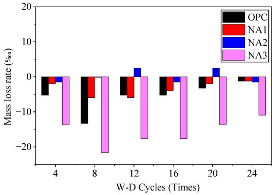 Figure 8 shows that specimens OPC, NA1, NA2, and NA3 recorded nearly no mass loss during the W–D cycle, and their masses increased instead. The masses of specimens OPC and NA3 increased particularly significantly. This, combined with the fact that the surface of the sample did not peel off during the W-D cycles, shows that the sodium sulfate solution did not cause noticeable damage to the surface of concrete during the W–D cycles. However, sodium sulfate crystals filled the pores inside the concrete to increase their mass. Their mass first increased and then decreased, indicating that the crystals had caused some damage to concrete during their circulation through it. The mass of sample NA3 changed because it contained too much NA. Its surface thus adsorbed a large amount of free water, leading to a decline in the workability of concrete through the formation of more internal pores as it is poured. The results indirectly show that sulfate-induced erosion and destruction occurred mainly due to the crystallization pressure, which was initiated in the pores of concrete and required a long erosion time. It was thus unfeasible to evaluate the resistance of concrete to erosion by sulfate based on the loss in its mass over a short period.