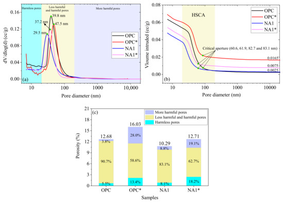 Figure 10b shows the cumulative curves of intrusion by mercury into the mortar specimens in the MIP test. The high slope coefficient area (HSCA) of the curves was mainly distributed in the range of 20–200 nm, indicating that the specimens were dominated by pores with diameters between 20 and 200 nm. The critical aperture of specimens OPC, OPC*, NA1, and NA1* were 83.1, 82.7, 61.9, and 60.6 nm, respectively, indicating that the erosion barely changed their critical aperture. The intrusion of mercury into specimens containing pores with diameters in the range of 200–20,000 nm was nearly unchanged, indicating that there were nearly no pores within this range of diameters in the specimen. The corresponding values of intrusion by mercury into specimens OPC, OPC*, NA1, and NA1* when they contained pores with a diameter of 20,000 nm were 0.0025, 0.0165, 0.0025, and 0.0075 cc/g, respectively. The values of mercury intrusion of OPC* and NA1* were larger than those of OPC and NA1. The largest value was obtained for OPC*, followed by NA1*. This suggests that the surface structures of OPC* and NA1* were rougher than those of OPC and NA1, and the surface of the former was the roughest due to erosion by the sodium sulfate solution, such that small voids in the sample became larger.
