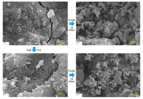 We chose pressed fragments of concrete specimens OPC, OPC*, NA1, and NA1* for SEM tests to observe their microstructural morphology. Figure 11 shows that features of the structural surface features, such as particle morphology, cracks, and pores, were apparent in all specimens, and cracks and pores were almost always present. Before they were eroded by the sodium sulfate solution, the structural surfaces of specimens OPC and NA1 were well integrated, with sparse pores and angular granularity. After erosion, the structure of specimen OPC became loose, the number of pores in it increased, and the angularity of the granules disappeared; it was chemically corroded. The number of pores in specimen NA1 increased slightly, but the signs of the granules being chemically corroded were not prominent. These results show that erosion by sodium sulfate caused significant damage to the internal structure of concrete, especially ordinary concrete. The crystalline matter was severely chemically corroded, the number of pores increased in number and size, and its internal structure loosened. Compared with ordinary concrete, erosion by sodium sulfate caused less damage to the internal structure of NA-modified concrete. This indicates that incorporating NA into concrete enhances its resistance to erosion by sulfate.