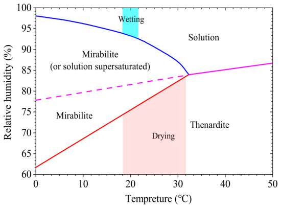 Sodium sulfate is the most widely used solution in tests of sulfate-induced corrosion, including surveys on the weathering of natural rock and durability tests of building materials. The porous material is usually soaked in a sodium sulfate solution in the test, and it is removed and dried at a specific temperature to form anhydrous sodium sulfate. Once it is subsequently cooled to room temperature, the sample is soaked in the sodium sulfate solution once again to hydrate it. Sodium sulfate is highly destructive when this process is repeated several times, where most of the damage caused by it occurs during the immersion phase [5]. This damage has been mainly attributed to the volumetric expansion caused by the hydration reaction [6]. It results from the growth of miscanthus crystals in a highly supersaturated solution produced by the dissolution of sodium sulfate [7,8]. The results of evaporation experiments by Rodriguez-Navarro and Doehned [9,10] showed that a saturated sodium sulfate solution caused much more damage to limestone than the evaporation of a saturated sodium chloride solution. Theoretically, the crystallization pressure generated by confined crystals increases with the degree of supersaturation of the solution [11]. Experiments have also shown that the growth of anhydrous sodium sulfate and miscanthus nitrate crystals may cause damage, depending on the relative humidity. When the relative humidity is lower than 50%, anhydrous sodium sulfate is better formed, while sodium sulfate decahydrate is more abundant when the relative humidity is greater than 50%. Experiments by Yang et al. [12] and Wang [13] showed that sodium sulfate can react with calcium hydroxide to produce gypsum, which causes concrete to swell and crack. Tian and Cohen [14] demonstrated that the swelling of ettringite and gypsum, caused by the reaction of sodium sulfate, can lead to the failure of concrete. Equations derived by Steiger and Asmussen [15] showed that the crystallization pressure is obtained mainly due to gypsum and ettringite.