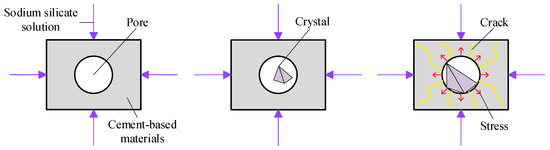 Correns [38] experimentally demonstrated the existence of the crystallization pressure in 1949 and quantified it using thermodynamic equations. The so-called crystallization pressure is the force of interaction between the solid product formed by the chemical reaction between sulfate and cement stone. Sodium sulfate crystallizes from water to form mirabilite; its volume expands by four to five times, and the expansion force causes concrete to crack such that its performance deteriorates. Sodium sulfate reacts with the products of hydration to form gypsum crystals, where this increases the volume of concrete by 1.2 times, and the resulting swelling force causes it to crack. Sodium sulfate undergoes a chemical reaction to form crystals, which grow and swell. The expansion force causes tensile stress along the edge of the concrete pores. When the tensile stress exceeds the tensile strength of concrete, cracks are generated, and the complex process of the sodium sulfate solution eroding concrete commences. Specifically, Figure 13 shows that when sulfate ions diffuse through the concrete material, they react with the products of hydration in the cement stone, and the products of this reaction are evenly distributed. If the volume of the product is greater than the volume of the reactant, the excess volume can be accommodated only in the pores of the cement stone. The crystals in the pores are deposits of excess solid. As the reaction progresses, the volume of the solid sediments slowly accumulates. When they come into contact with the wall of the hole, the resulting pressure leads to stress in the material. When this stress exceeds the tensile strength of concrete, nanocracks begin to form in it. When the solid sediment does not have the same shape as the pores, it does not fill them to generate pressure.